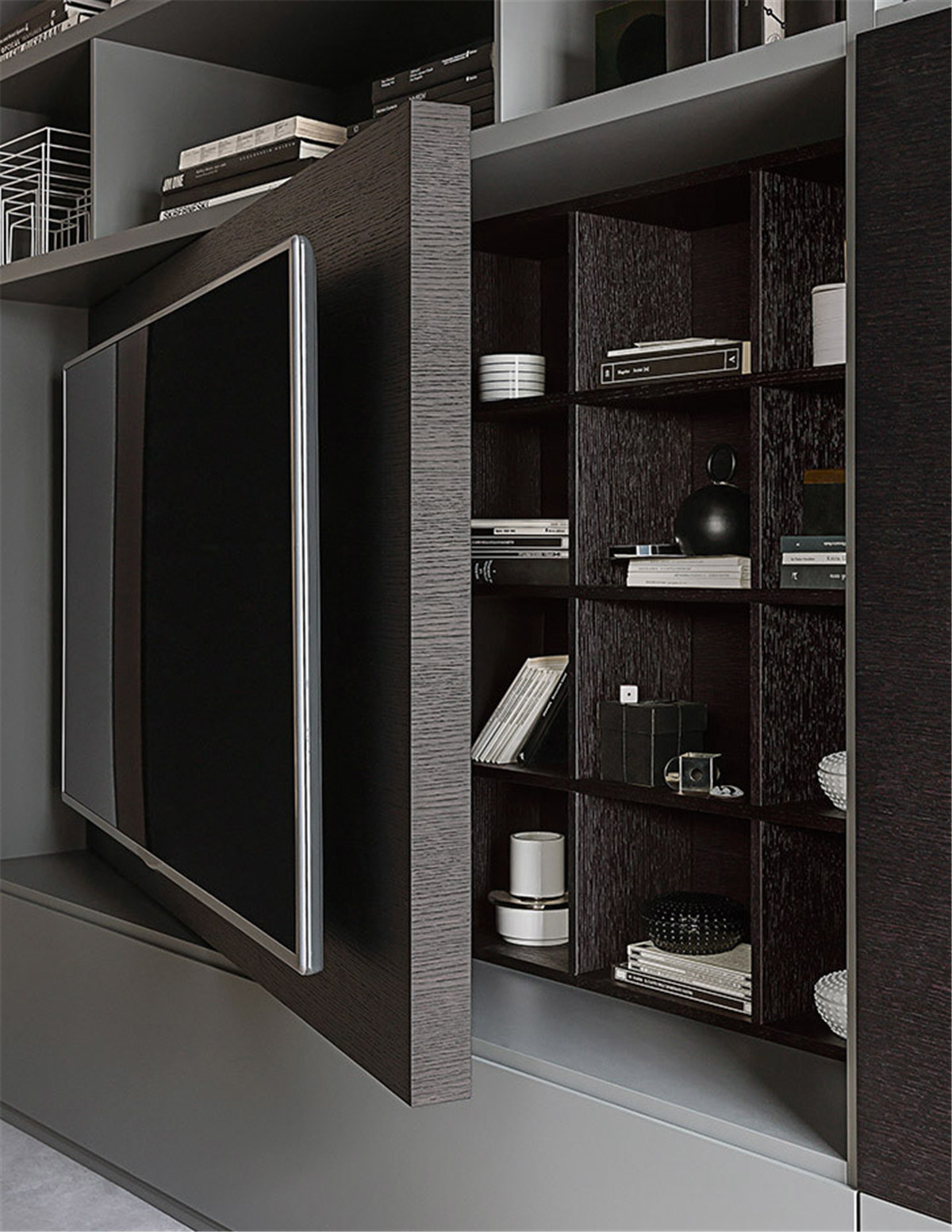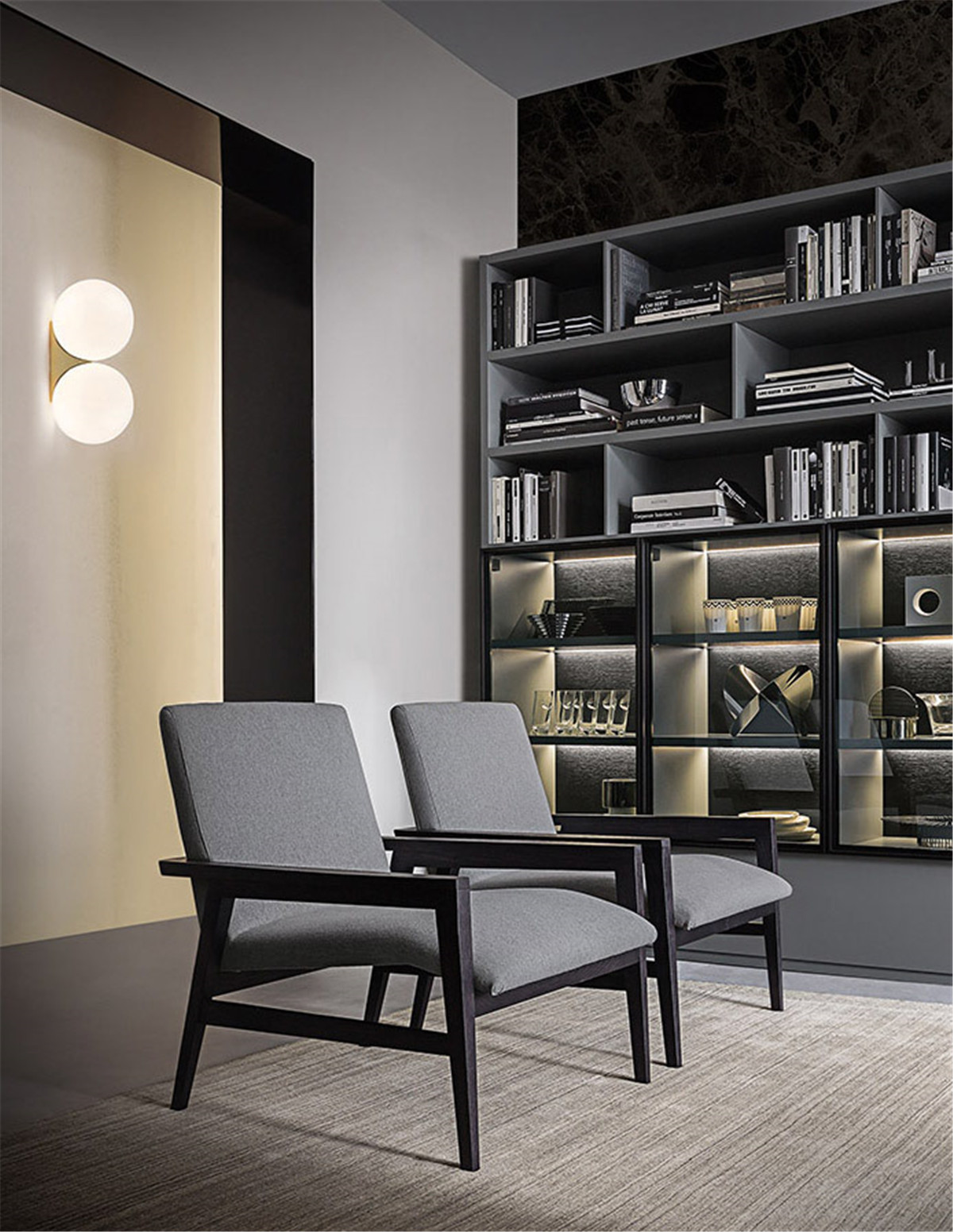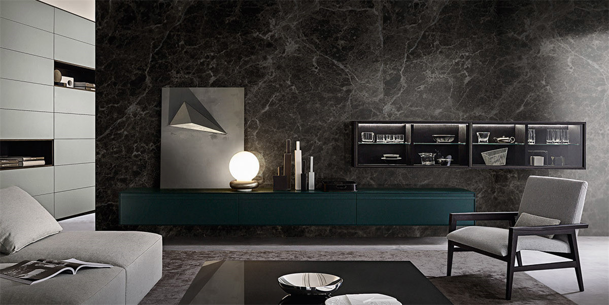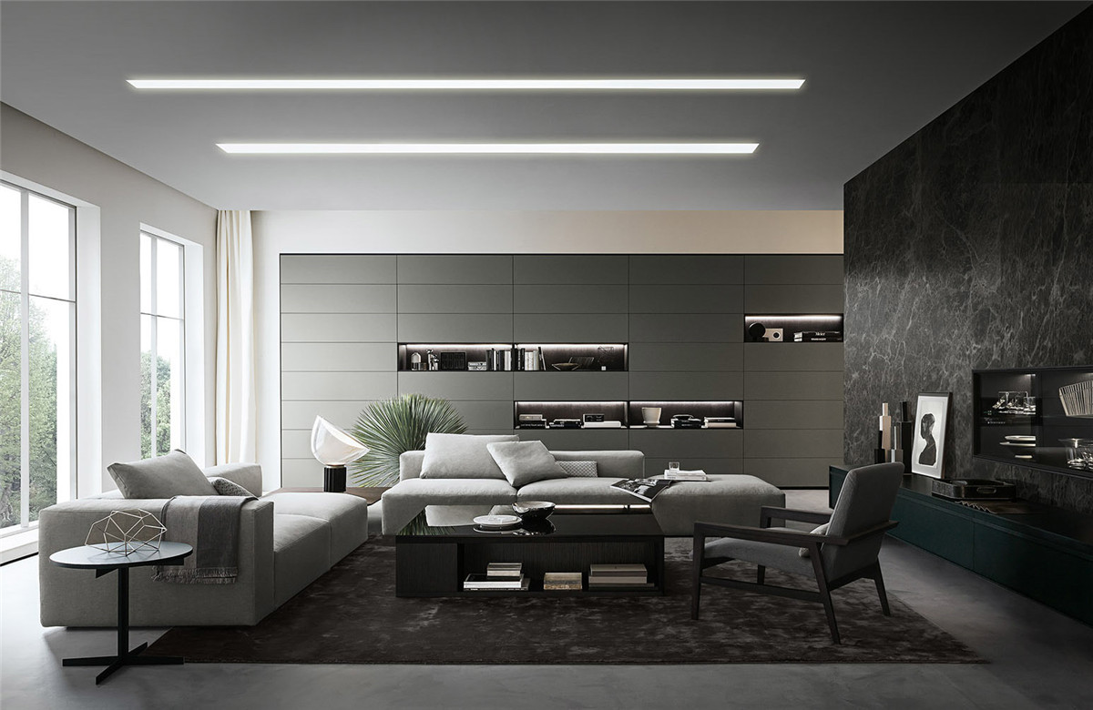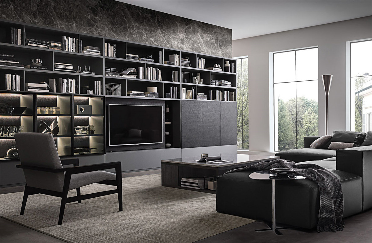 想要拥有一颗平淡的心,又想要拉近与幸福的距离。 希望平淡的生活,简单而不枯燥, 宁静而不乏色彩,令人安慰而又不是止步不前。 简洁的黑白灰,整体的冷色调里, 两个人温暖舒适的窝在沙发上看场电影,结束一天的疲惫。公共空间墙面都刷了深灰色的墙漆,柜子用了黑色和木色,所有的配色都是黑白灰和木色。因为客厅的采光非常好,所以即便深色为主也不会觉得有任何压抑的感觉,反而会比浅色更让人觉得放松