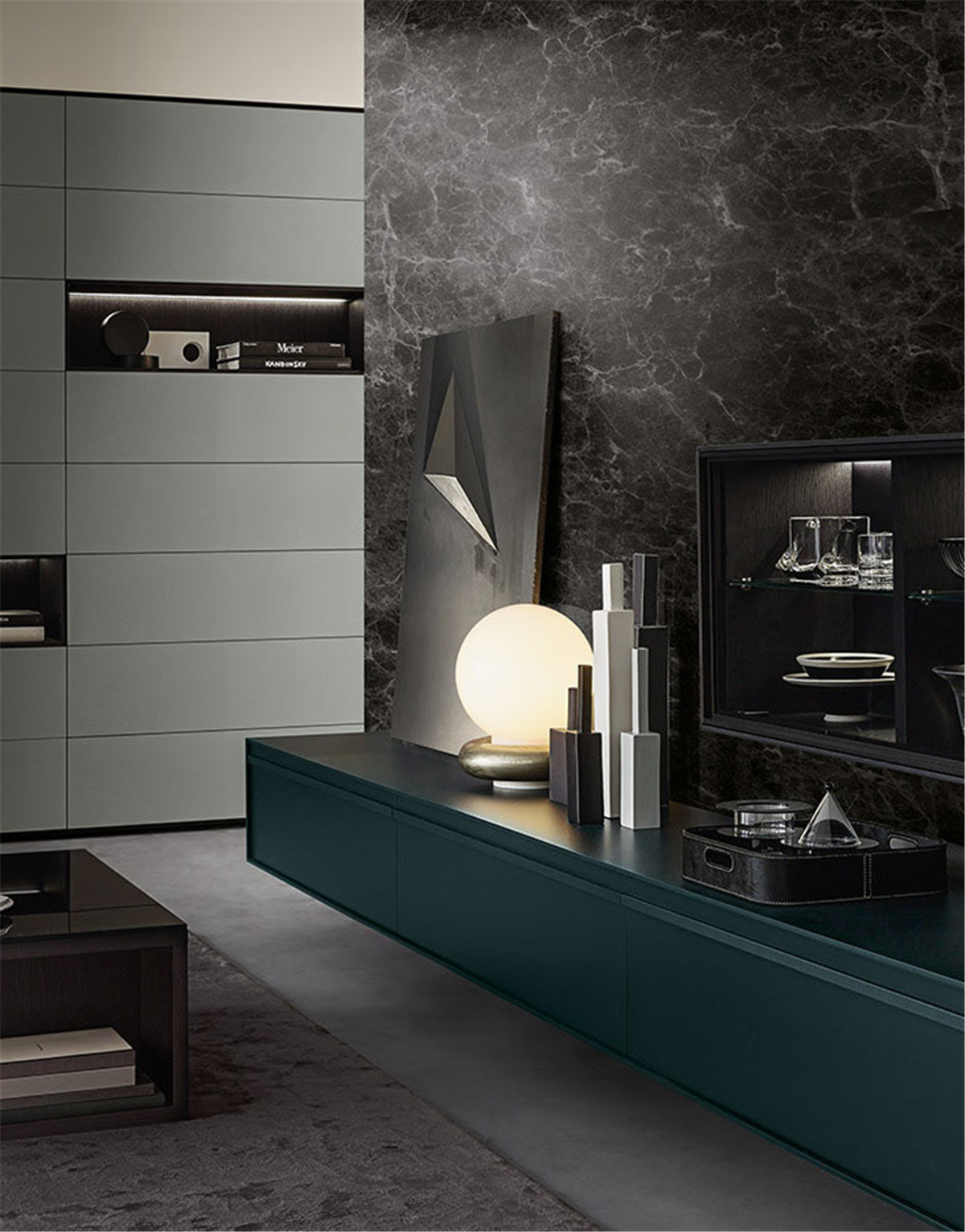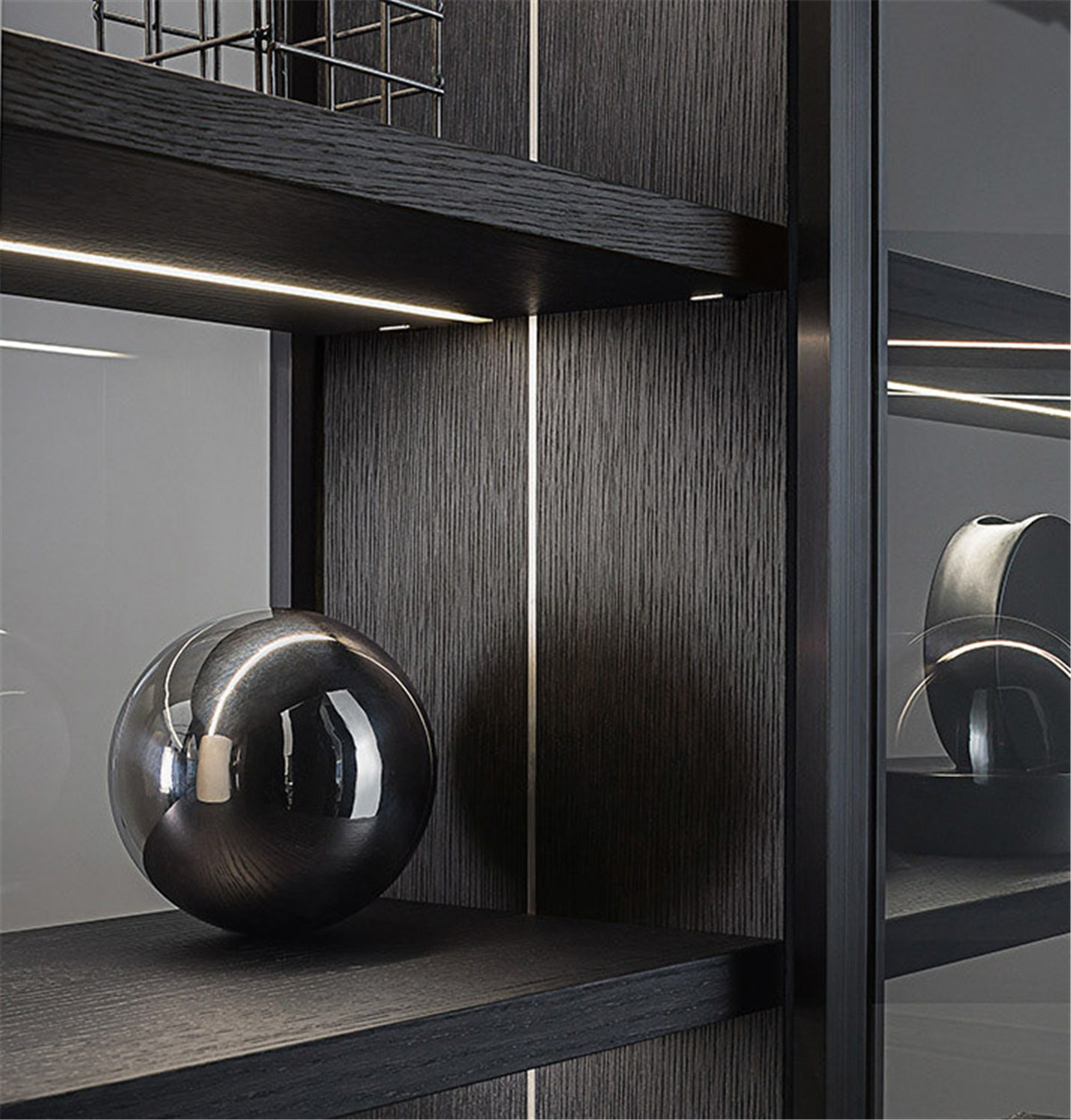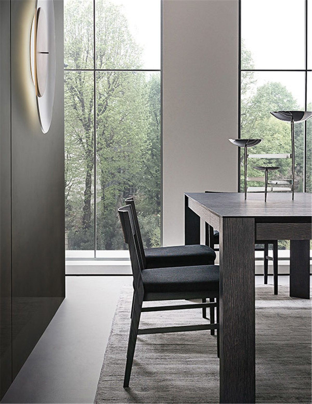 想要拥有一颗平淡的心,又想要拉近与幸福的距离。 希望平淡的生活,简单而不枯燥, 宁静而不乏色彩,令人安慰而又不是止步不前。 简洁的黑白灰,整体的冷色调里, 两个人温暖舒适的窝在沙发上看场电影,结束一天的疲惫。公共空间墙面都刷了深灰色的墙漆,柜子用了黑色和木色,所有的配色都是黑白灰和木色。因为客厅的采光非常好,所以即便深色为主也不会觉得有任何压抑的感觉,反而会比浅色更让人觉得放松